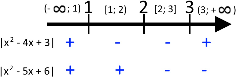 Тепер потрібно знайти знак кожного модуля на кожному проміжку. Це можна зробити підставляючи число з кожного проміжку в підмодулевий вираз і дивитися на знак результату.